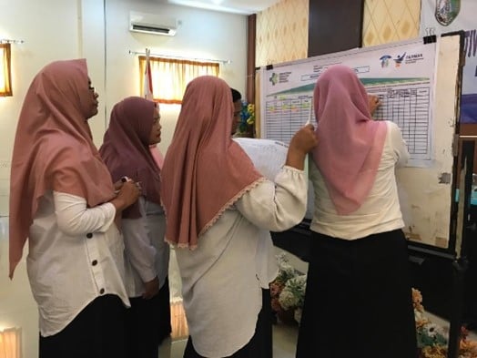 Immunization officers and village midwives practicing the use of the defaulter tracking tool “My Village My Home” (Credit: WHO/ Dewi Ayu)