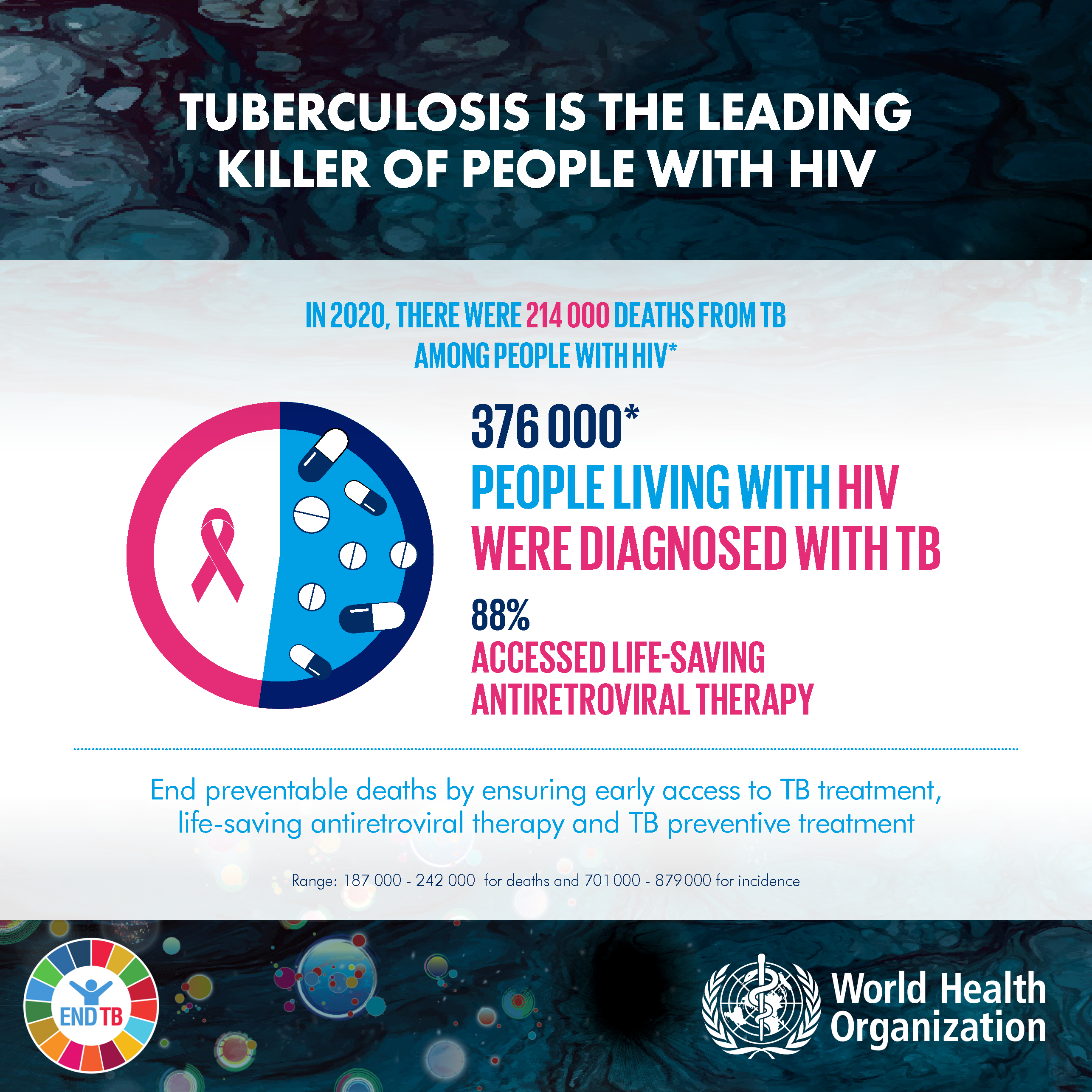 Whilst the last decade has seen an average annual reduction of 10% in TB/HIV deaths, the COVID-19 pandemic has reversed this trend, with an increased number of deaths in 2020, compared with 2019. Less than half of the people estimated to have HIV-associated TB were diagnosed and notified in 2020. TB preventive treatment among people with HIV has seen an impressive scale-up over the past few years, achieving more than the 6 million milestone target set at the 2018 UN High-Level Meeting on TB, 2 years in advance. However, still not all in need have access to TB preventive treatment, including among people with HIV and especially among household contacts of people with confirmed TB disease.