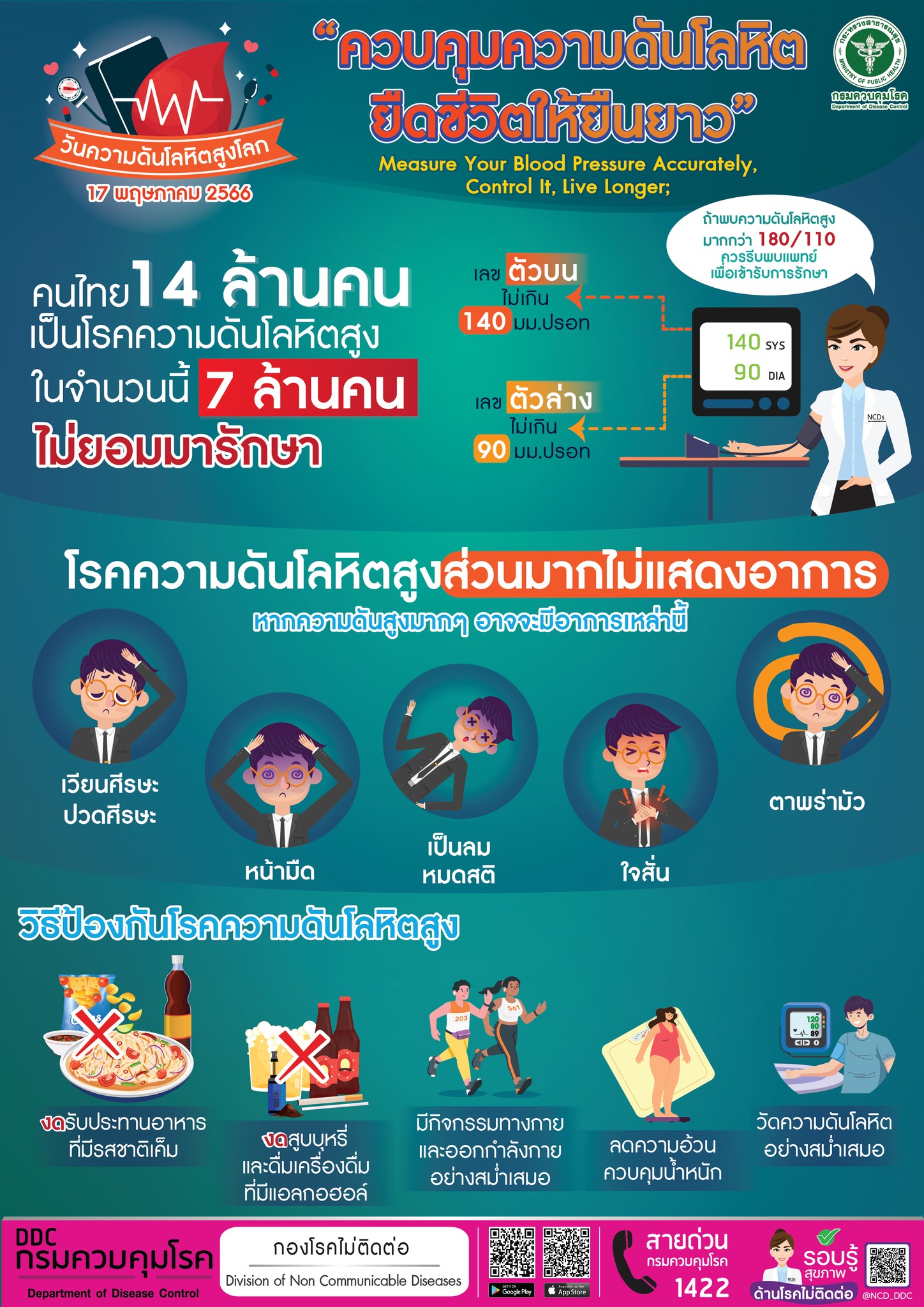 The Ministry of Public Health of Thailand commemorated the World Health Day 2023 with an online advocacy campaign calling the public to “Know their numbers” by measuring their blood pressure regularly and correctly.  According to the National Health Examination Survey, in 2021, the estimated Thais with hypertension is 14 million   and only about 50% of them are recorded to be under treatment. The campaign focused on reaching out to the remaining 7 million who has raised blood pressure and are not aware of it. This is one of the innovative steps by the Ministry of Public Health in improving the proportion of Thais with hypertension under treatment to reach the target of improving the hypertension care cascade with more than 60% control rate.